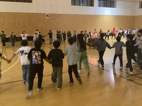 夕食後体育館に集まった子どもたち。キャンドルファイヤーのスタートです。