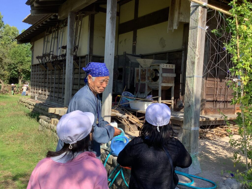 潟来亭の管理人さんが、菜種を選別する機械について教えてくれました。花が種となり、また次の年の花に繋がっていると聞き、「アサガオと同じだ!」の一言が飛び出しました。1年生の学びを2年生に繋げることができました。