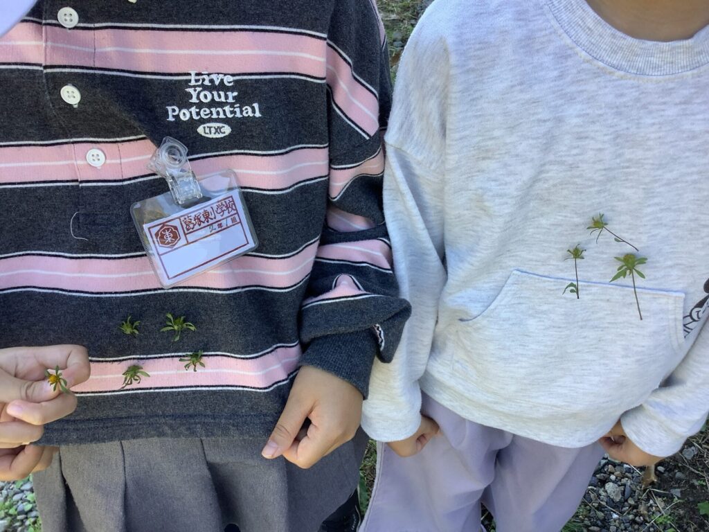 ひっつき虫として知られているアメリカセンダングサを見付けた子どもたちは、洋服に並べて付けたり、遠くから投げて誰が真っ直ぐに並べられるかで競ったりと、楽しく遊んでいました。