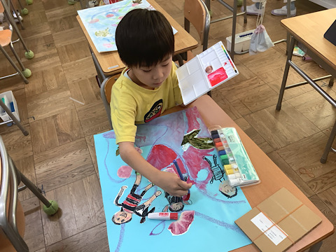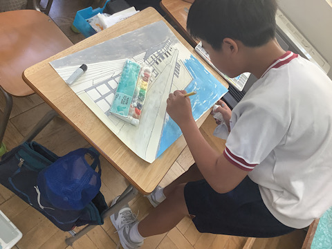 どの学年もある程度まとまった時間をとり、絵画制作を行っています。すでに作品が出来上がりケースに入れ名札を書いている学年、仕上げの段階に入っている学年等、その進度はさまざまですが、すてきな作品であふれています。