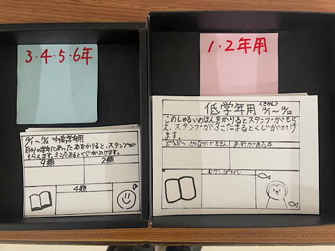 なるほど、3~6年のカードを見ると、9類(文学)、2類(歴史・地理)、4類(自然科学)の本をそれぞれ読むと、くじが引けるようです。