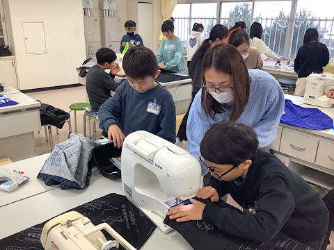 慎重に、折り目に沿ってできるだけ真っ直ぐ布を送ることを意識していた子どもたち。ボランティアの皆様と関わり合いながら、楽しく活動していました。