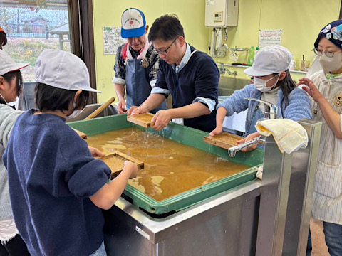 菱風荘では、「福島潟ヨシあし和紙の会」の皆様から、和紙づくりを体験する場を提供していただきました。福島潟に群生する「ヨシ」を材料にすいた和紙。とても貴重な体験となりました。