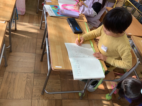 鉛筆や消しゴム等、直接比べられるものから、テープなどを使って間接的に長さを比較していた1年生。