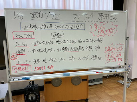 この日は、(株)フリーウェイツアーの藤田様をお迎えし、旅行プランの立て方について講義を受けました。