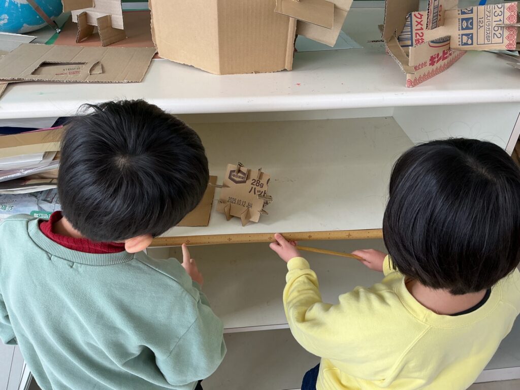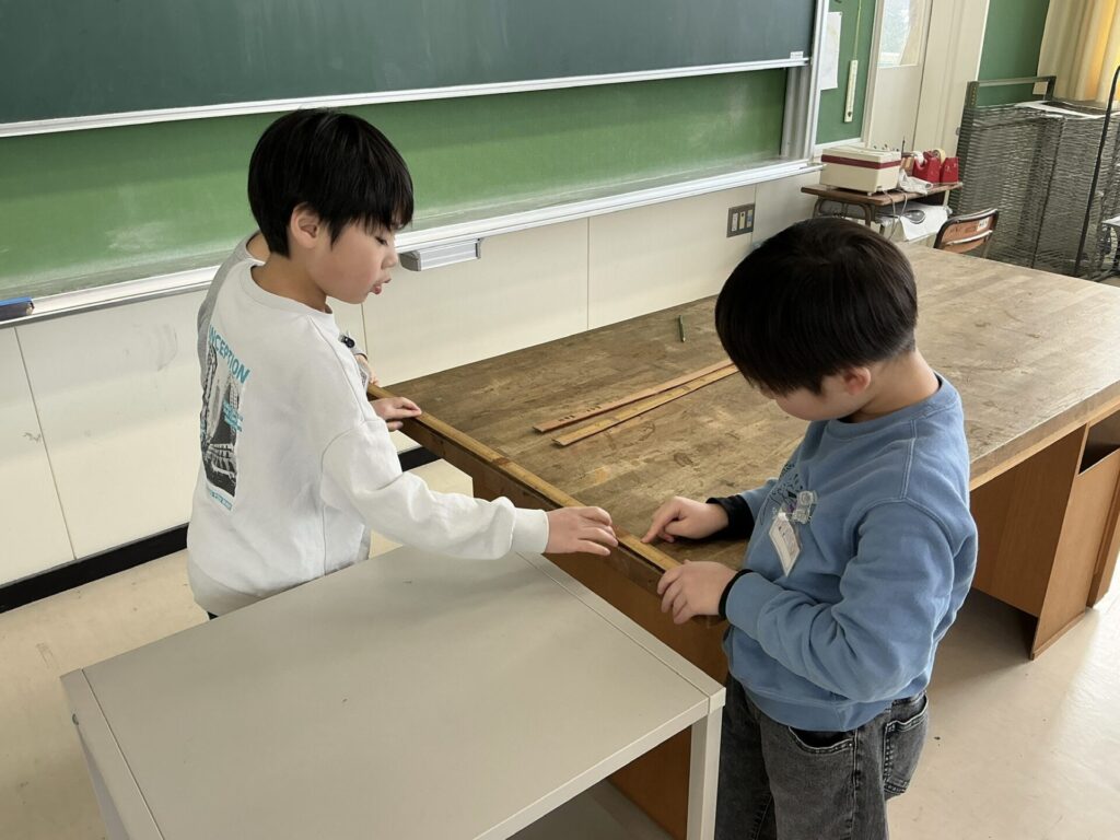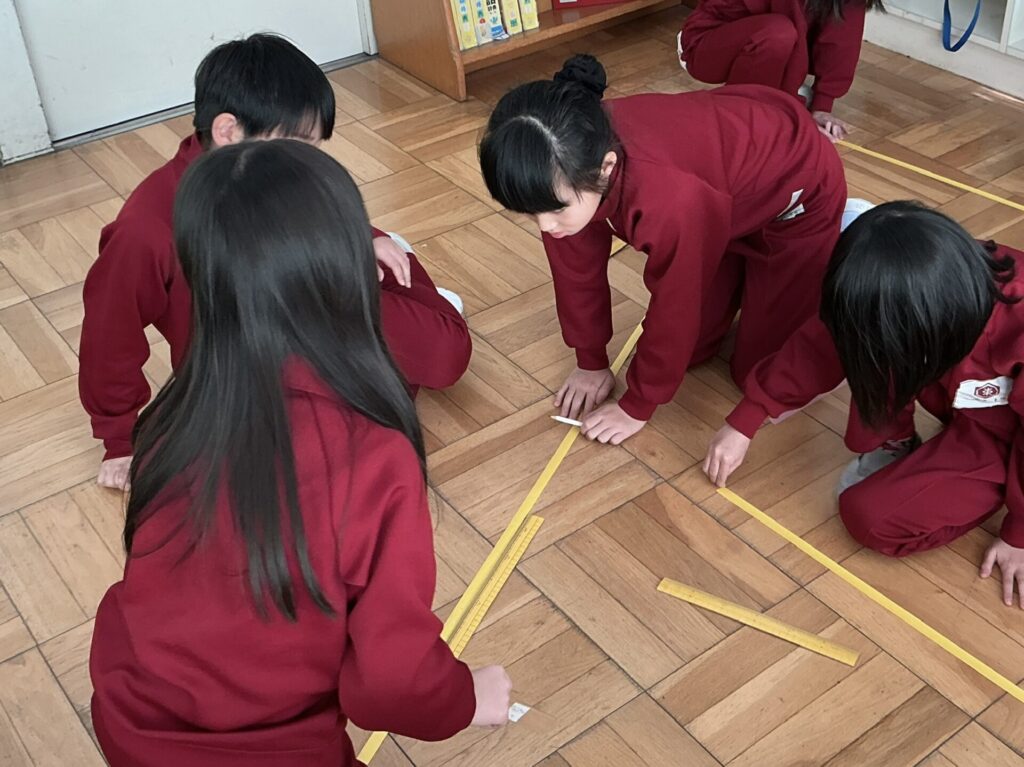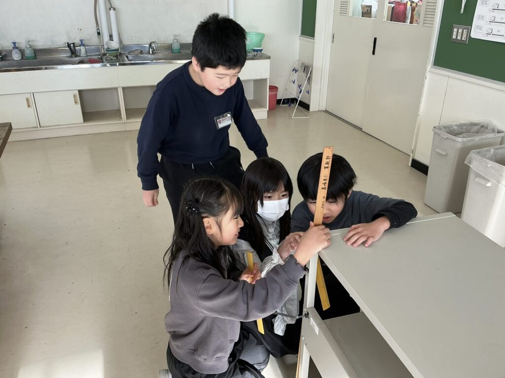 「これなら机の横の長さも測れる!」「ロッカーも測ろう!」「教室以外の物も測っていい?」と楽しそうにいろいろな物の長さを測る姿が見られました。