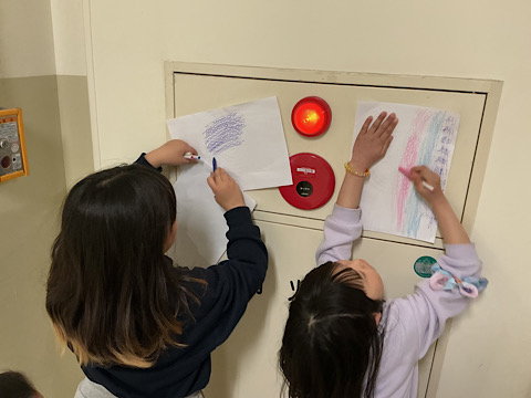 丸や四角の模様を写しては、「いいねー!」「わたしも!!」等と繰り返す子どもたち。