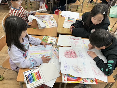 紙とクーピーを持った1年生が、校舎のあちこちで見られました。