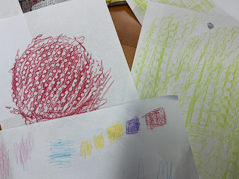 紙の上で、何やら一生懸命クーピーを走らせています。