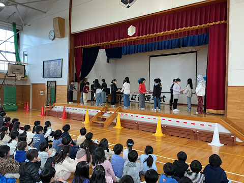 この日の朝、児童朝会が行われました。9つある委員会の新・旧委員長が登壇し、全校児童の前で「引継ぎ式」を行いました。