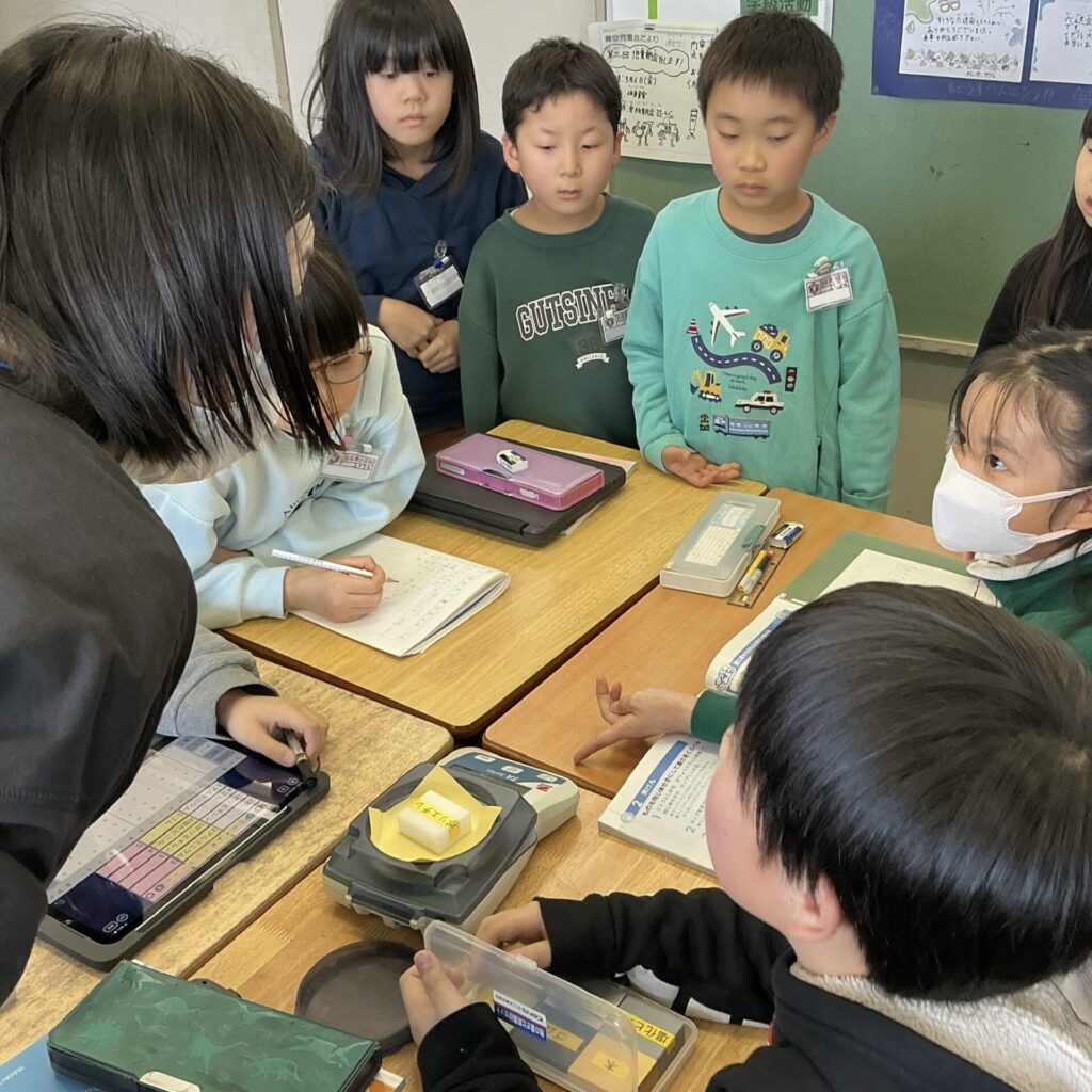 理科、書写、音楽の授業の見学にも出かけました。理科の授業では、物の重さを比べている様子を見学しました。自分たちで器具を正しく扱い、実験をする姿にとても驚いていました。