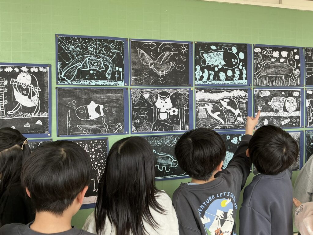 廊下には、図画工作の版画作品が並んでいます。「3年生の版画は、僕たちの作品よりも細かくてきれいだね!」「どうやって作ったんだろう?」と、素敵なところをたくさん見付けました。