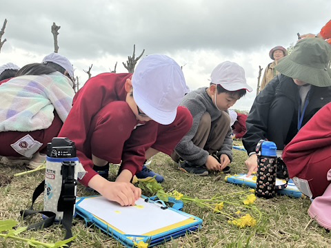 目の前に広がる菜の花畑の一角が、一つ上の学年の先輩がまいた種からなるものだときき、自分たちもかかわってみたいという意欲が増した子どもたちでした。