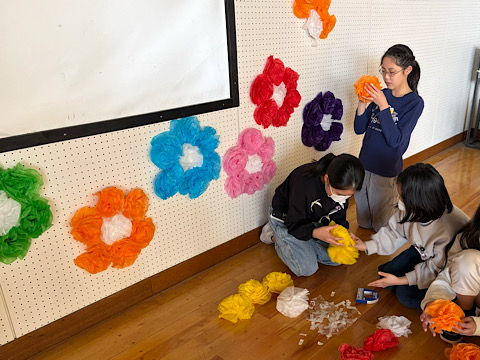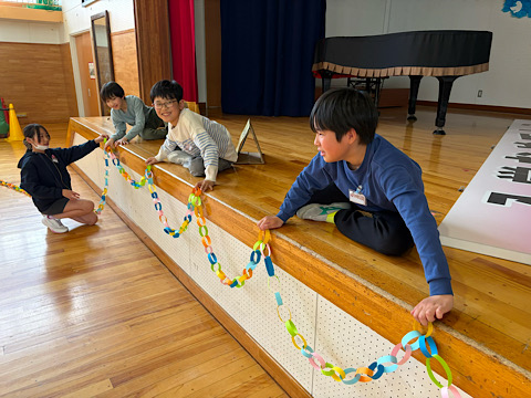 また、5年生は、会を行う体育館(ステージ)の飾り付け。どんな会になるか思いを馳せながらセッテイングしていました。