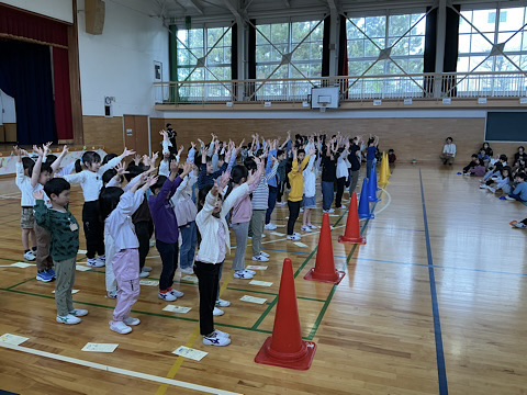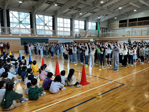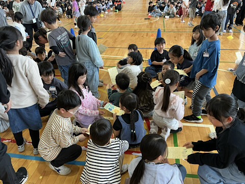 葛塚東小学校では、入学式に1、2、6年生が参列するため、2〜6年生が揃って1年生を迎える初めての会となりました。