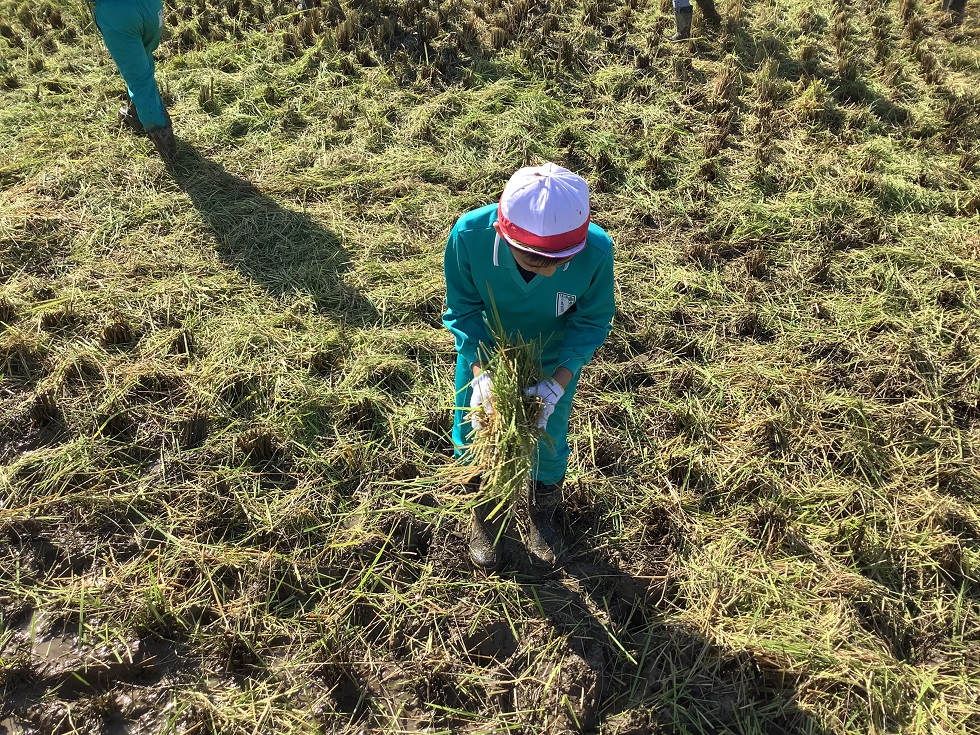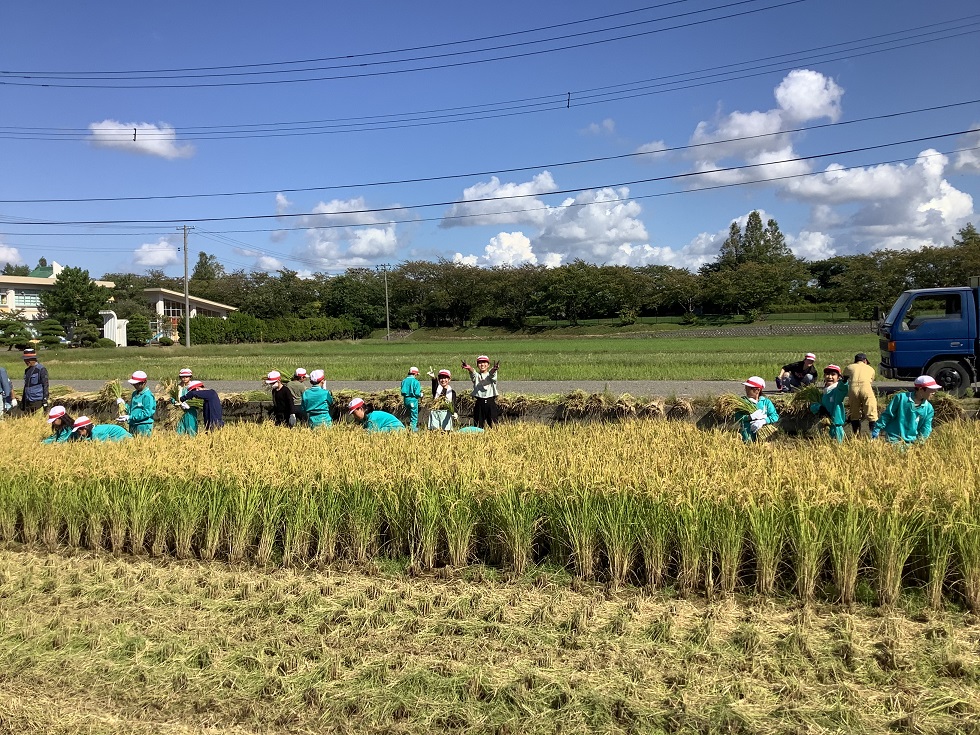 稲刈りの指導は、日頃からお世話になっている小林さんに加え、8名のボランティアの方々にもご協力いただきました。 はじめは恐る恐る鎌を動かしていた子どもたちも、慣れてくると「ザクッ!ザクッ!」とテンポよく刈り進め、あっという間に稲刈りが終わりました。 自分たちの力で刈り取った黄金の稲穂を手に、どの子の顔にも 大きな満足感と誇らしさが輝いていました。
