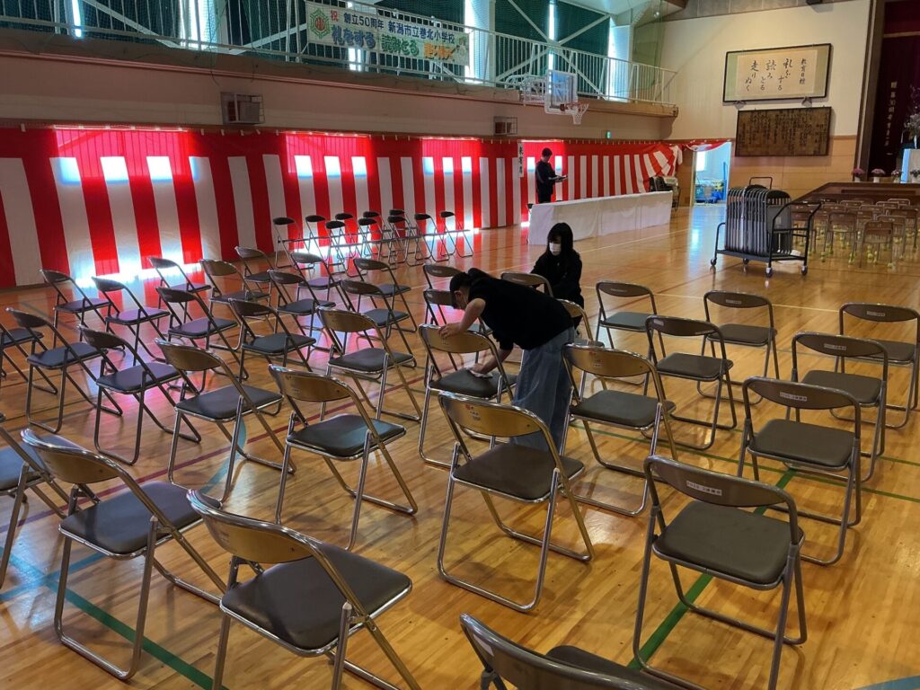 始業式のあとには、明日行われる入学式の準備を行いました。 新しく仲間入りをする1年生のために、6年生と職員が力を合わせて会場設営や教室の清掃に取り組みました。