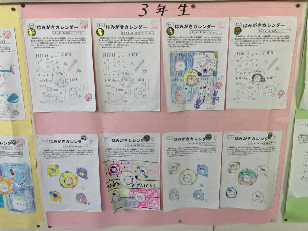 体育館の渡り廊下には「歯磨きカレンダー通り」と名付けられた掲示物がありました。歯の健康週間中に毎日の歯磨きを頑張った人を紹介するためのものでした。子どもたちの地道な努力に感心するとともに、保健委員会の子どもたちが考えてくれたバラエティー豊かなカレンダーの様式に見入ってしまいました。全校の歯磨きへの意欲が高まるために工夫してくれたことが伝わり、「自分力」「関係力」「創造力」の意識が子どもたちに浸透していることを感じ、うれしい気持ちになりました。