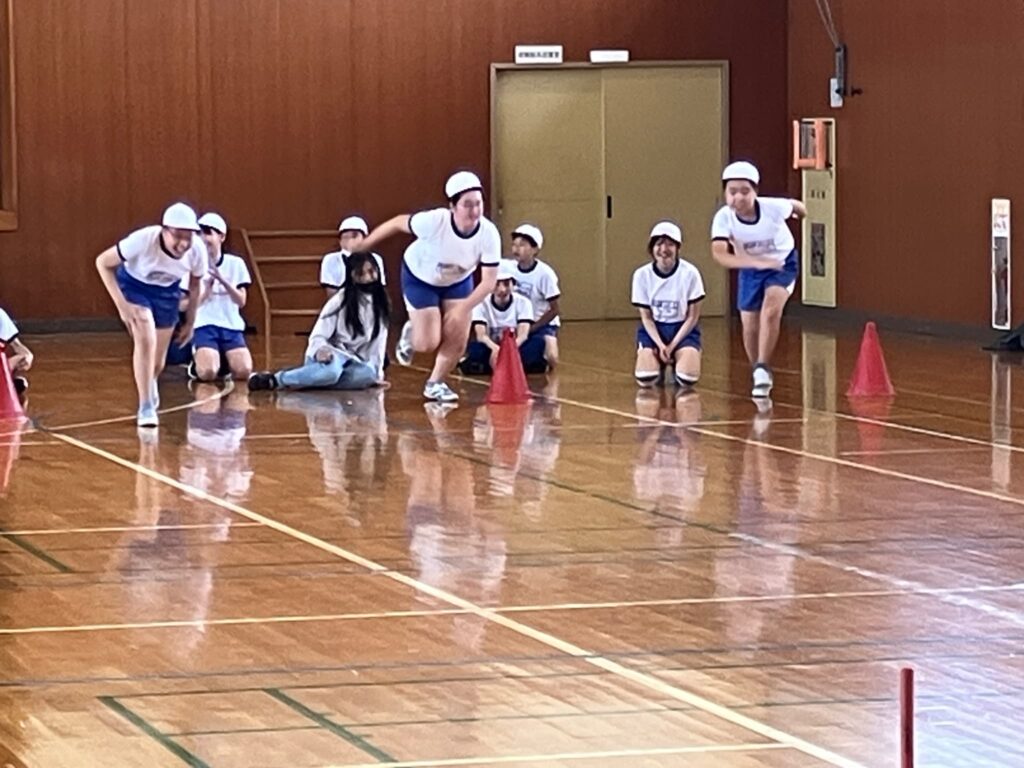 その他の学年の人たちも、暑い中で頑張っていましたよ。6年生は体育のダッシュ運動をしていました。1本のバトンを誰が早くつかめるか「ビーチフラッグ風」ゲームです。