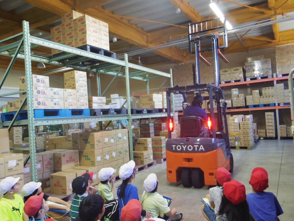 倉庫では店長さんがフォークリフトを実際に動かして見せてくれました。高い所にもすみずみ商品の箱を置くなどして、スペースを上手に使って整理・保管しているそうです。