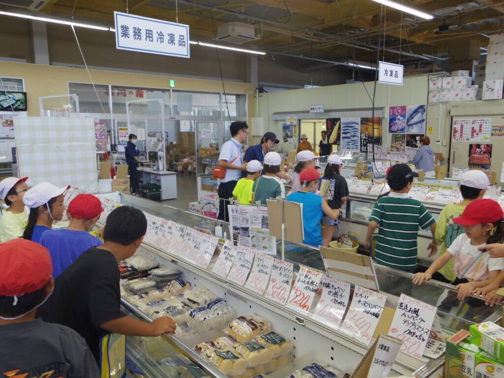 今日は、3年2組が社会科の校外学習のため、中央卸売市場の中にある「新印食品」さんにおじゃまして、お店の様子を見学したり、働く人の考えにふれたりしてきました。