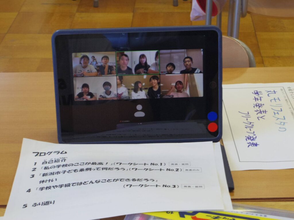 まずは、それぞれの学校の特色ある取組を伝え合いました。丸山小は、得意なことや好きなこと発表の場「マルモリフェスタ」があることをアピールしました。その後、新潟市子ども条例の中で特に大切だと思うことや、こうなるともっとよいなという意見を交流しました。