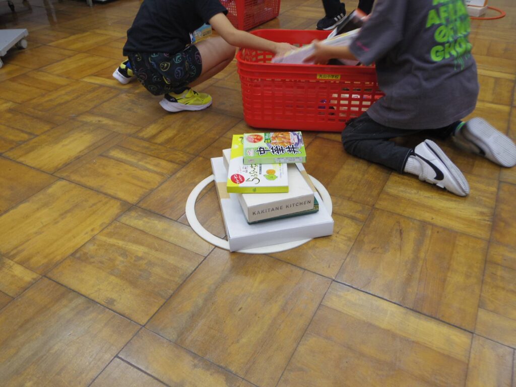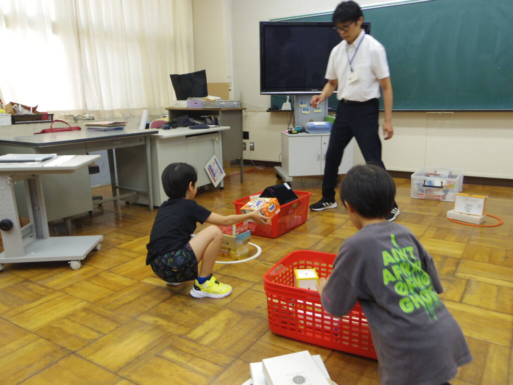 算数の箱の形の学習です。どうやったら速くたくさん上に箱を積めるか、子どもたちは箱の特徴を整理しながら、考えていきます。大きな箱を下にしたほうがいい。筒の形はたてにおいたほうがいい。など、子どもらしい言葉で気付きを語り合う姿、そしてその気付きを認め、賞賛しながら、意味付けして学びに変換して行く先生の姿、見ているこちらも楽しくなる笑顔あふれる授業でした。