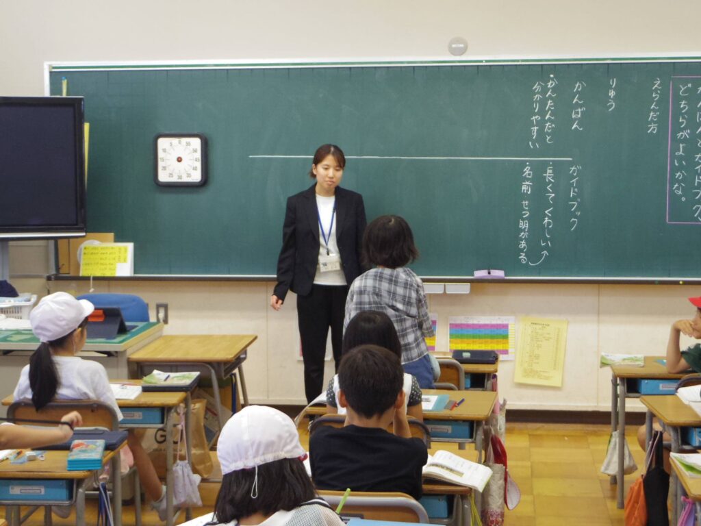 看板とガイドブック「どっちがいいか」という課題でしたが、互いの考えを交流しながら、それぞれにそれぞれのよさがあること、目的に応じて表現の仕方が違うことを子どもたちは理解することができました。子どもの気づきを促す声かけや、つぶやきを拾い上げるアンテナなど、先生の丁寧な配慮が行き届いていました。