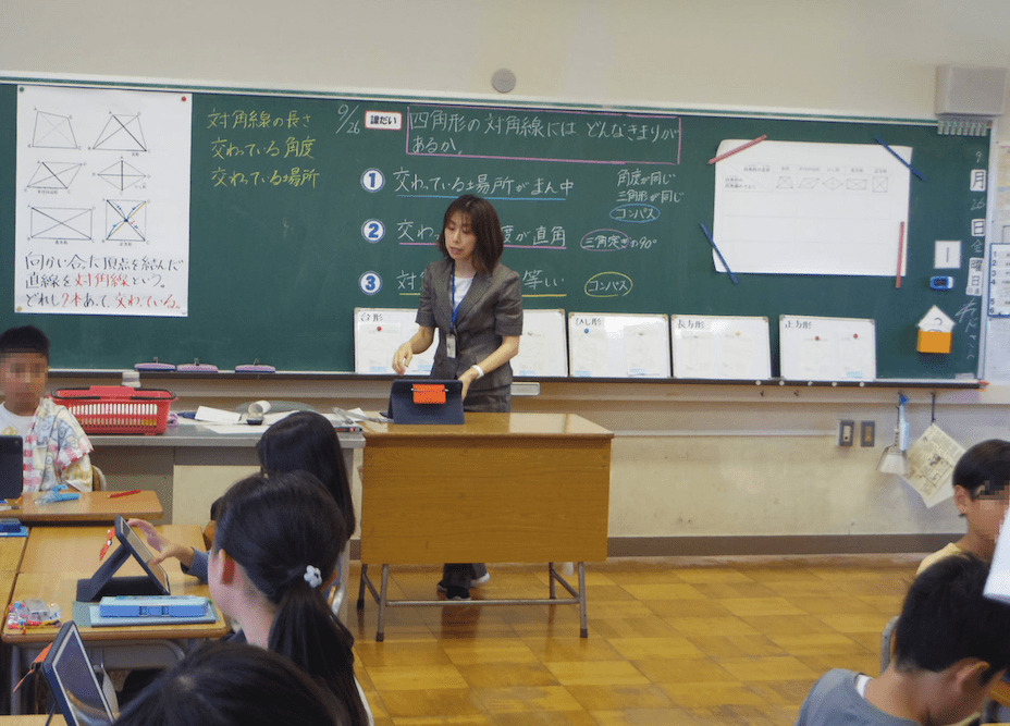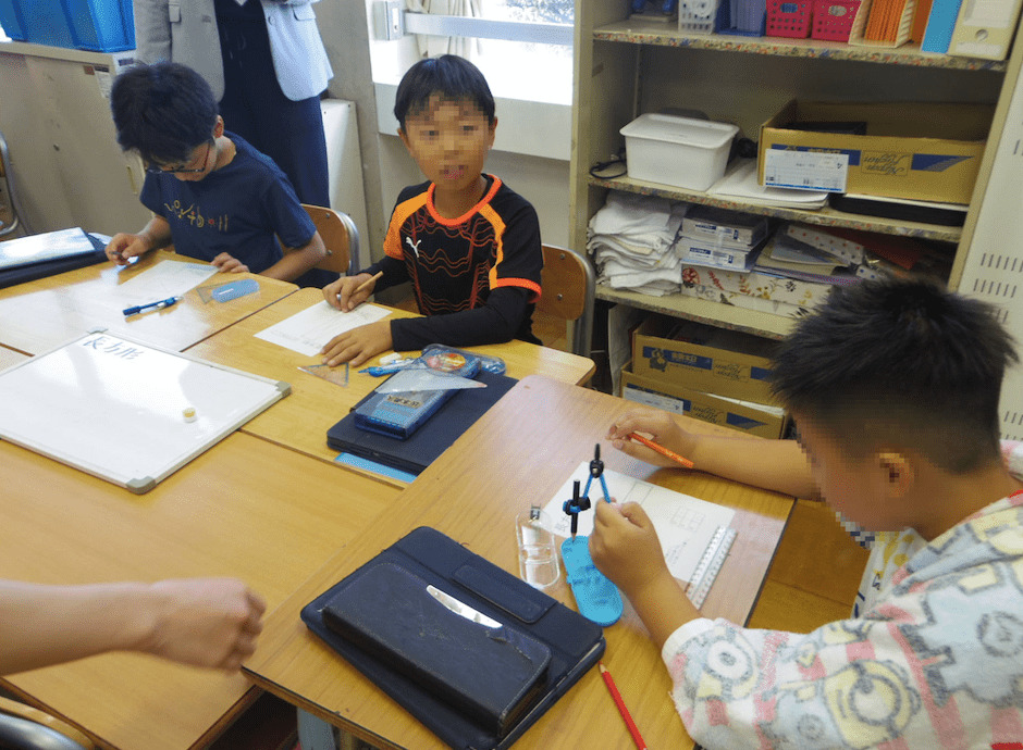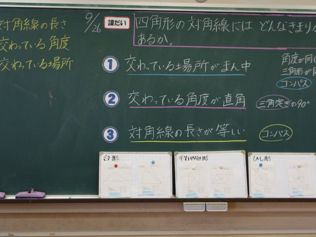 4年生のクラスは算数で図形の対角線についての学習でした。正方形、長方形、平行四辺形、ひし形、台形、それ以外の四角形など、6つの図形の対角線の特徴をグループの友だちと調べながら、自分たちできまりを見付けようとしていました。