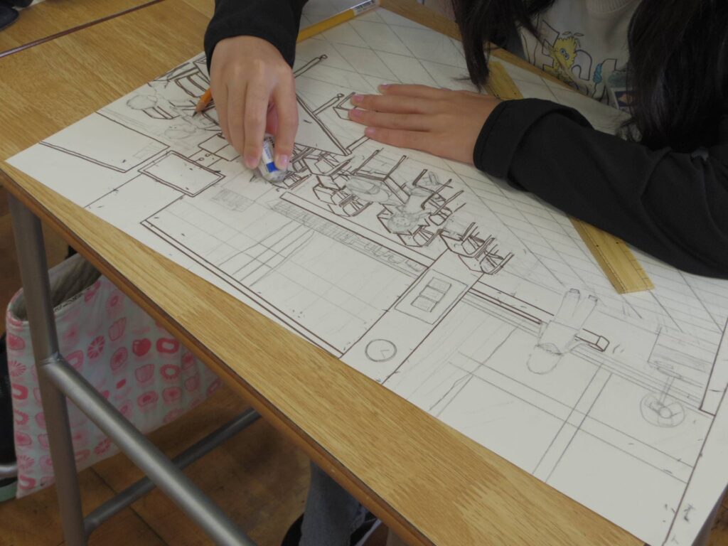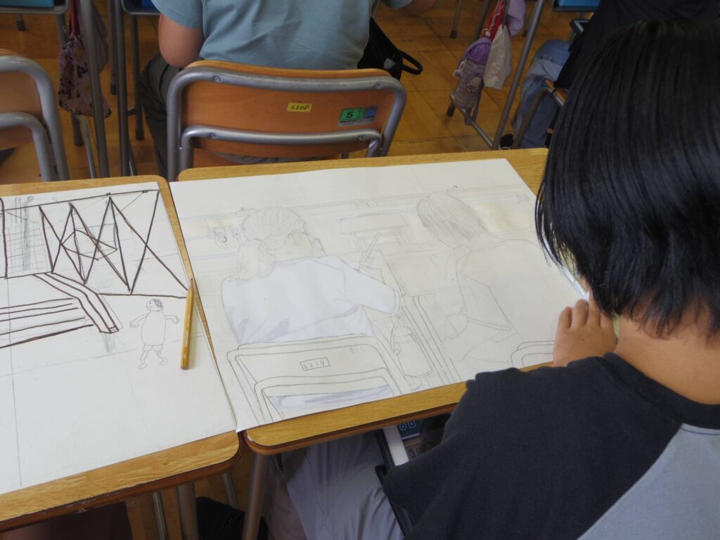 6年生は図工で思い出の校舎をテーマに絵を描いていました。さすが6年生、緻密で写実的な絵がこれだけ描けるんですね。