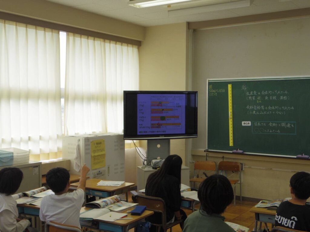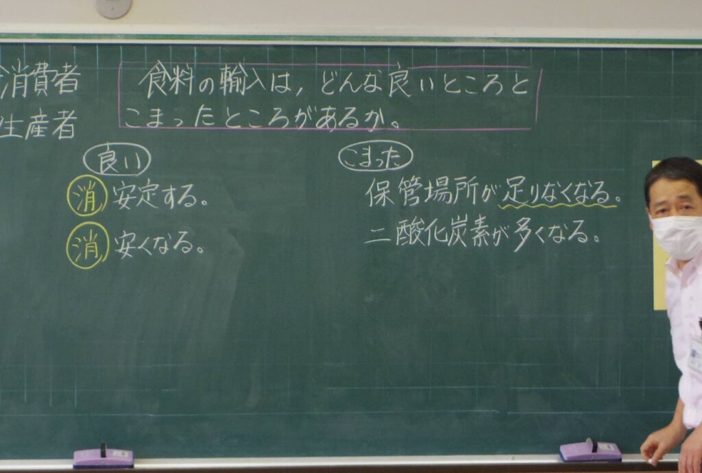このクラスでは、輸入のデメリットとして「物を輸送するとCO2が発生する」ことを発言していました。昨年度、総合学習で学んだSDG'Sの知識を生かした発言であることに先生はすぐに気付き、価値づけをして、黒板に書き入れます。