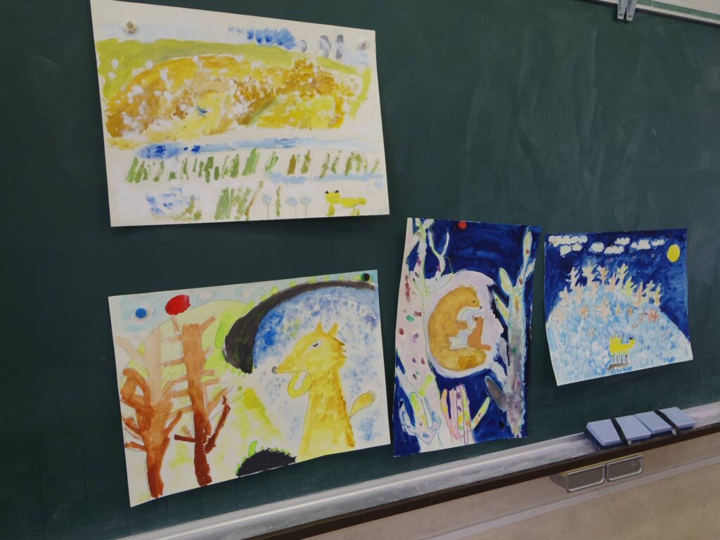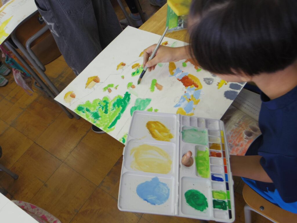 4年生も国語と図工のコラボ授業です。ごんぎつねのお話を基に描いた絵に色を塗っていました。自分だけのオリジナルの色をパレットに作るのって楽しいですよね。気持ちを込めて丁寧に作業していました。