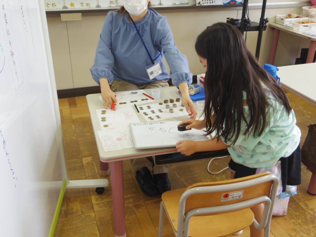 こちらも教科横断的指導の場面です。自分たちの育てた野菜の売上金を集計する算数の場面です。机の上には本物のコインがたくさん並んでいます。大繁盛だったんだね。