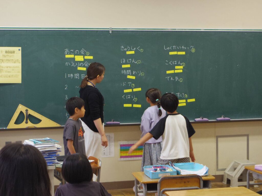 2年生では係決めをしていました。自分のやりたい係の所にネームプレートを貼っています。一度選んだ後に、人数のバランスを考えたり、やりたい人の気持ちになって考えたりして、譲り合う姿に感心しました。中には、「私は全部の係をやりたい!」と意欲旺盛な子もいて、大変微笑ましかったです。