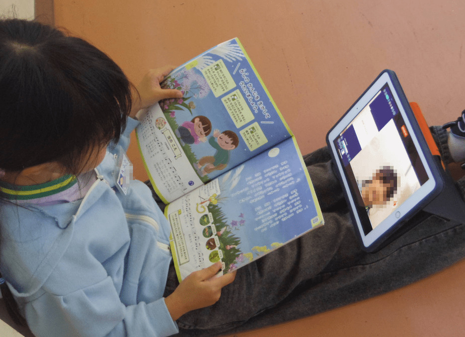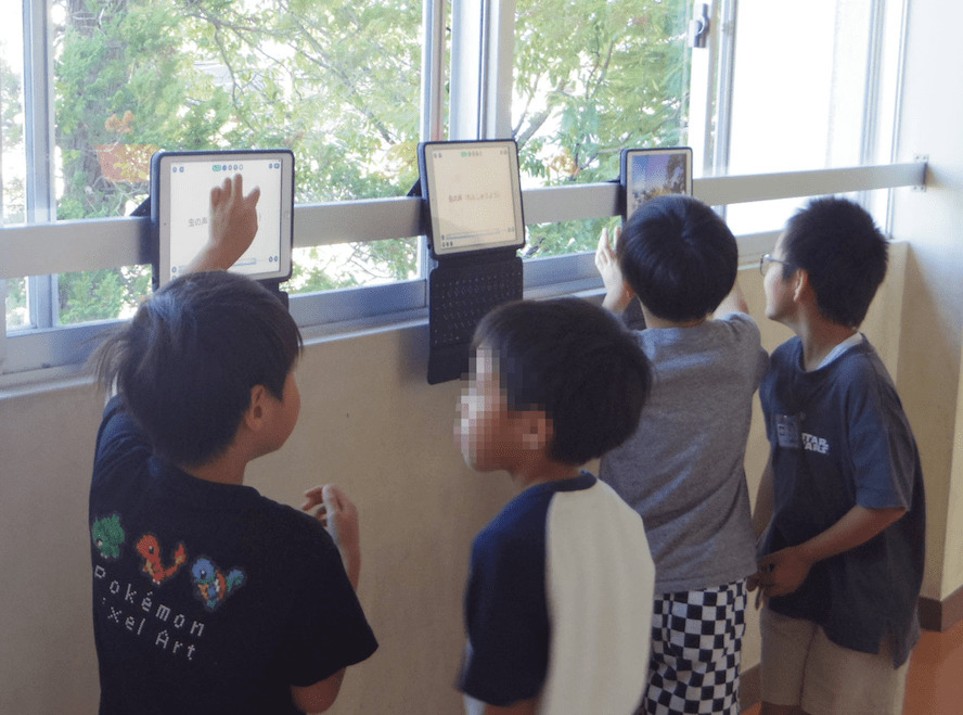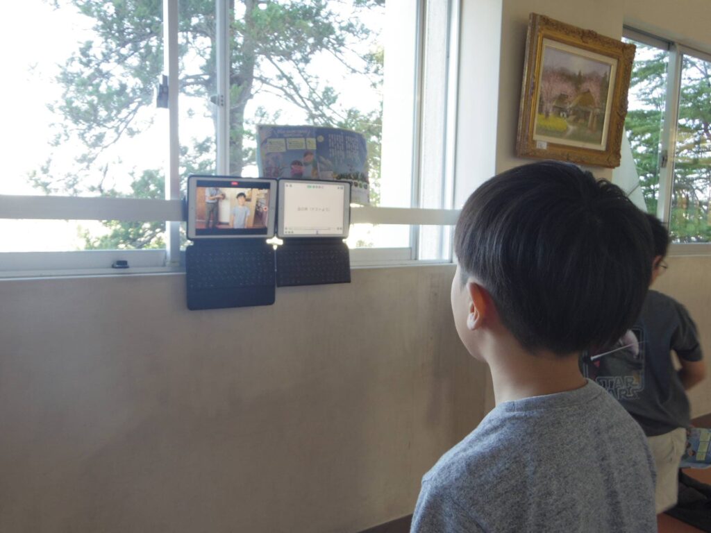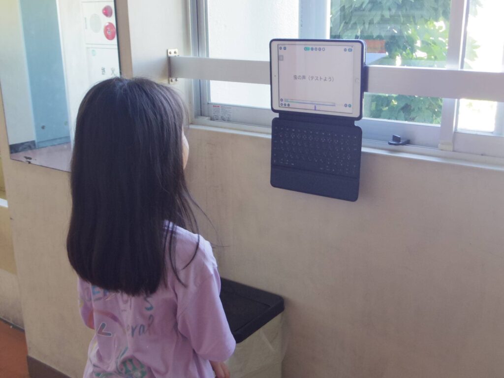 校舎の中に戻ると、2年生の廊下からきれいな歌声が聞こえてきます。「虫のこえ」という歌を動画に撮りながら練習していたのでした。