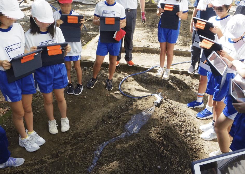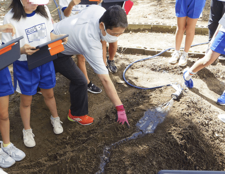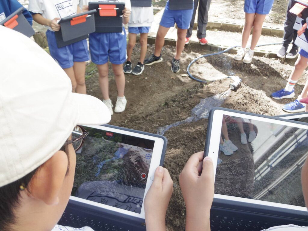 「あっ!石が運ばれている」「深くけずれている!」など、子どもからつぶやきがちらほら聞こえてきます。先生は「いい発見ですね」とそのつぶやきをすぐに拾い上げます。理科の用語である「侵食」「運搬」「堆積」をあえて使わず、子どもの実感から出たそのままの言葉を大切にして、気付きをつなげながら観察の視点を与えていきます。