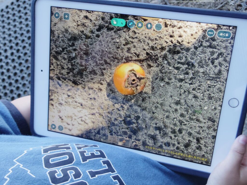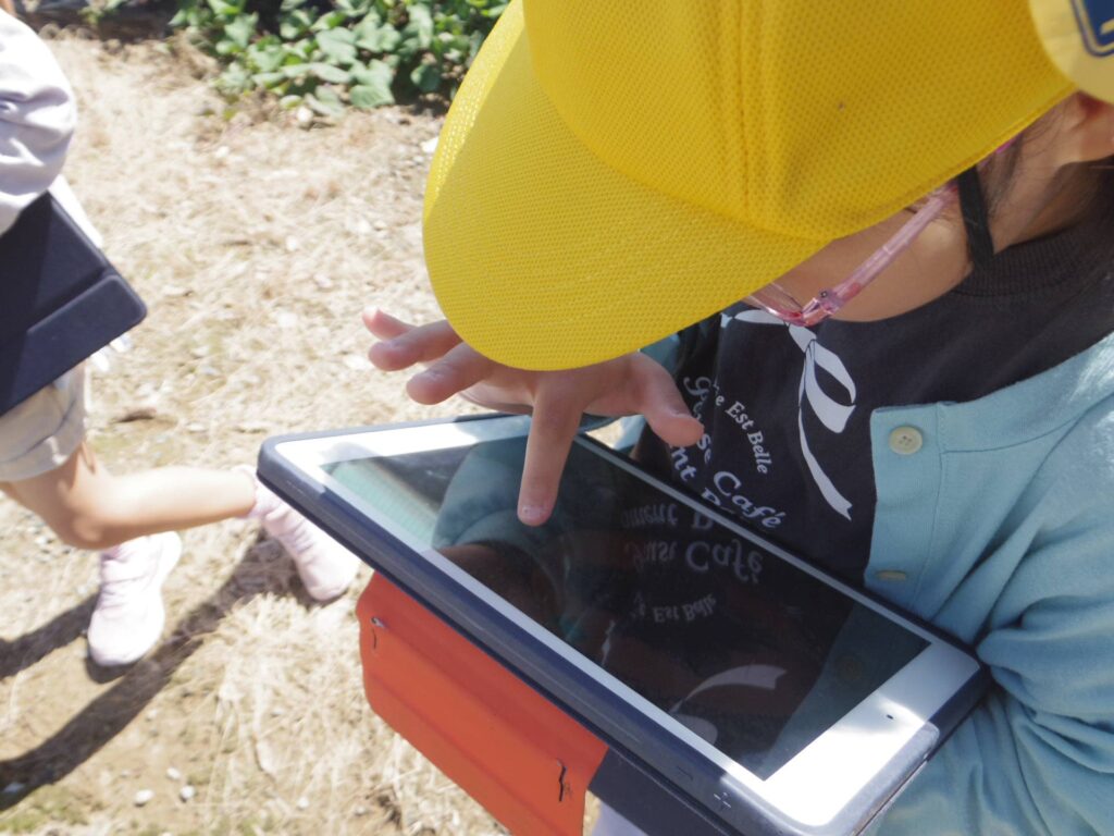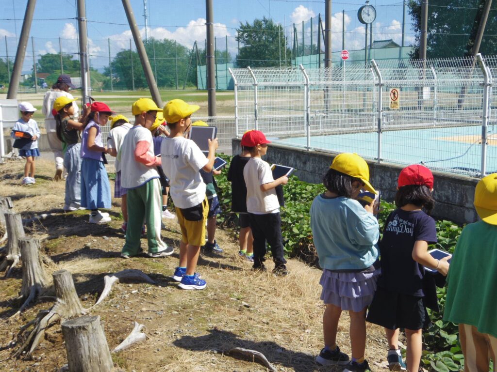1年生は生活科で「あきみつけ」をしていました。秋の主役のムシたちや、木の実などをタブレットで写真に収めていきます。夏休み前にみんなと楽しく泳いだプールは、今ではアメンボたちの遊び場になっていました。