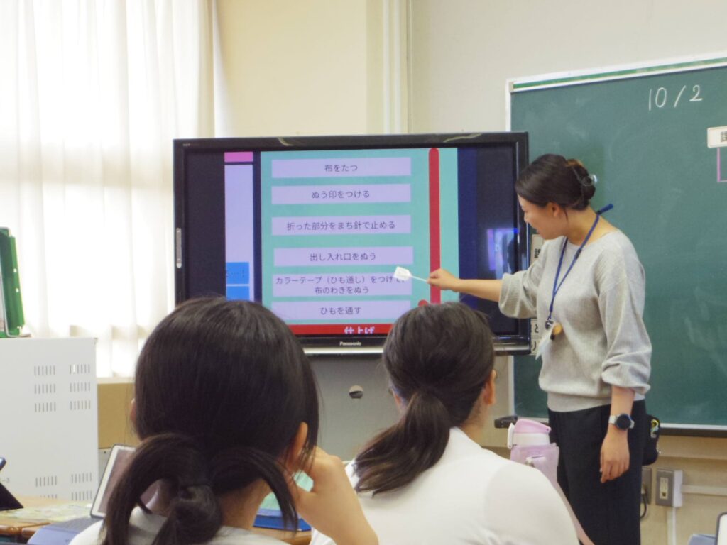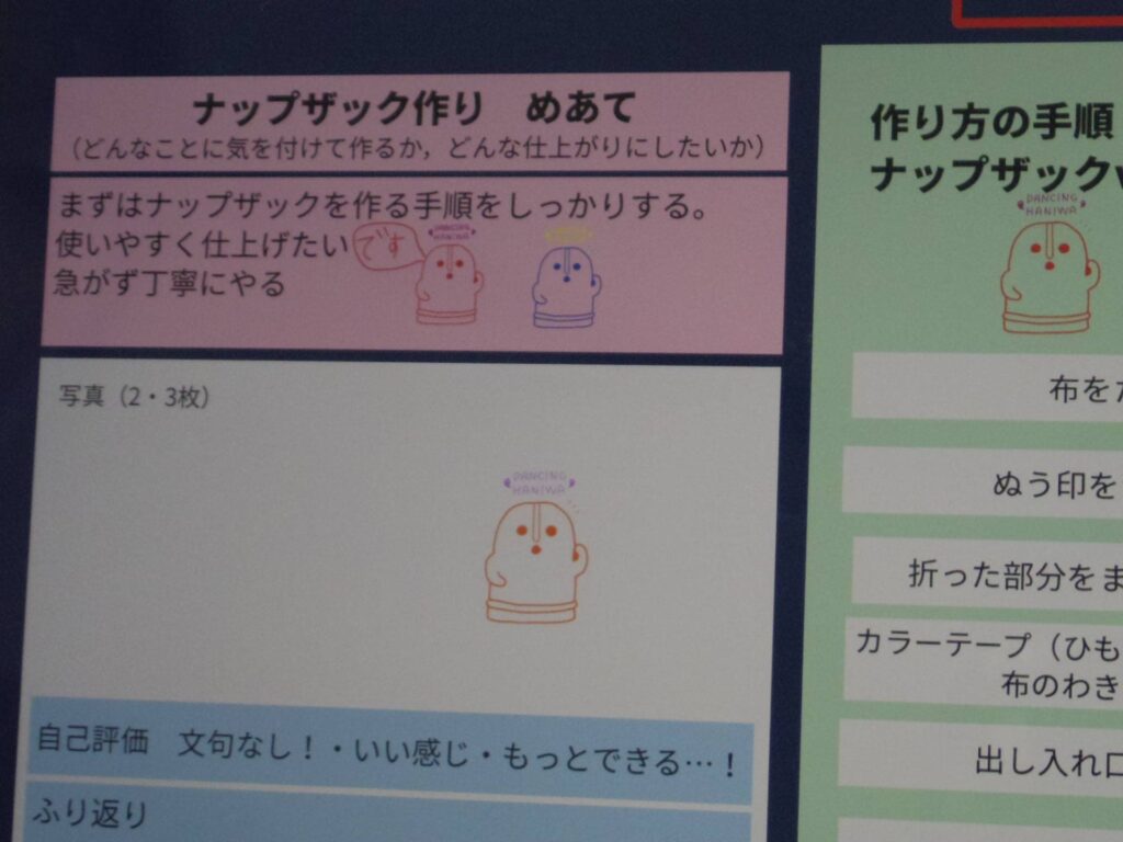 裁縫でつくる予定のトートバッグとナップザックの作り方の手順を考える授業です。あえて最初から正解を示さず、子どもに順序を考えさせることで、より深い学びをねらっています。