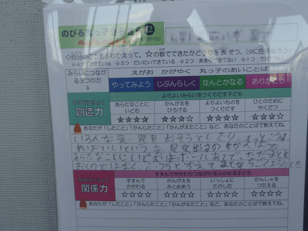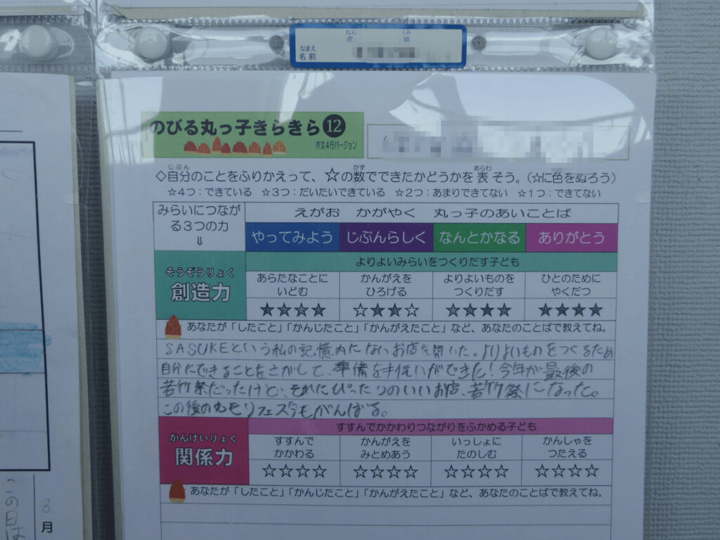 学校教育ビジョンで目指す3つの資質・能力「自分力」「関係力」「創造力」について、子ども自身が振り返りをして自己評価したり、そう思う根拠やエピソードを書いたりするカードです。今年度は1年間かけて全部を記述することにしています。前期終了を目前に各クラスで子どもたちに自分の頑張りや成長を自覚させるために書かせ、これからどんどん廊下に掲示していく予定です。