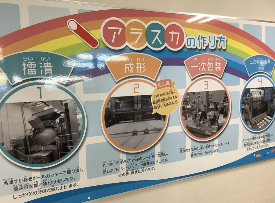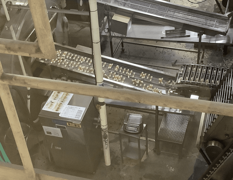 そして、いよいよ工場内見学です。ガラス越しに見える製造ラインにじっと目を凝らします。見えた、見えた、ちくわだっ!