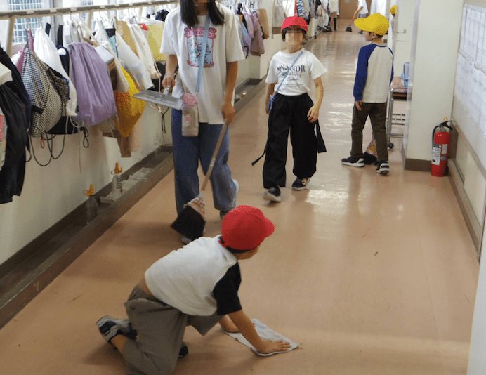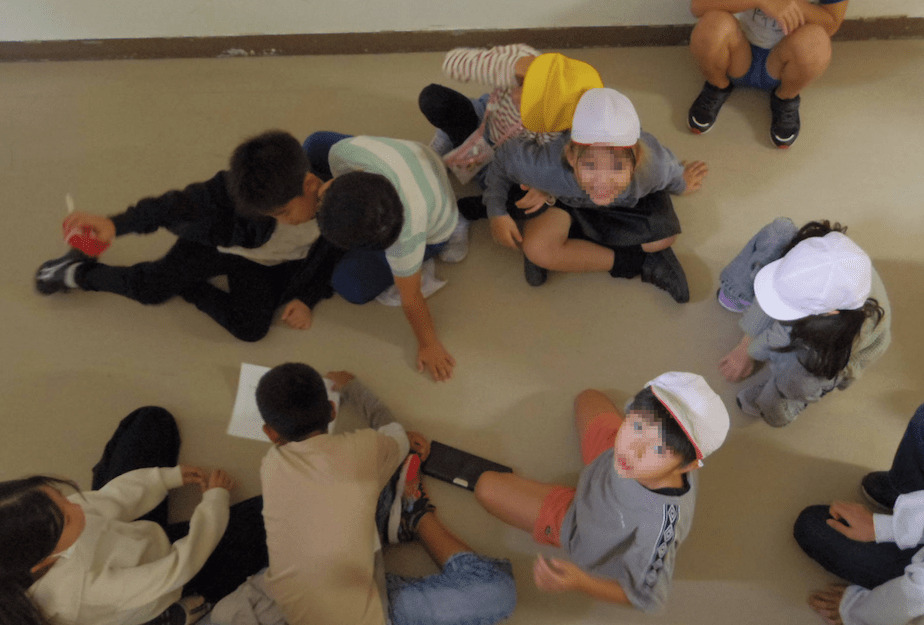 給食後は、後期の清掃打ち合わせです。班で輪になって分担やそうじの仕方を確認していました。