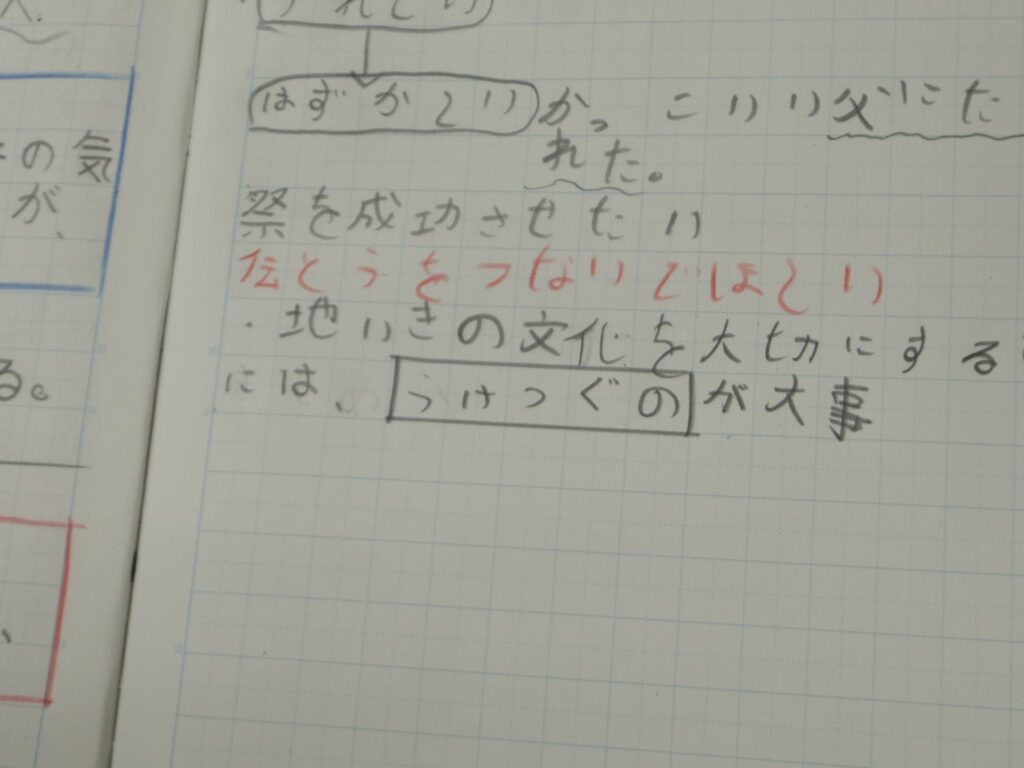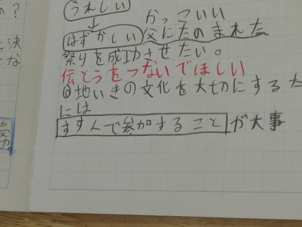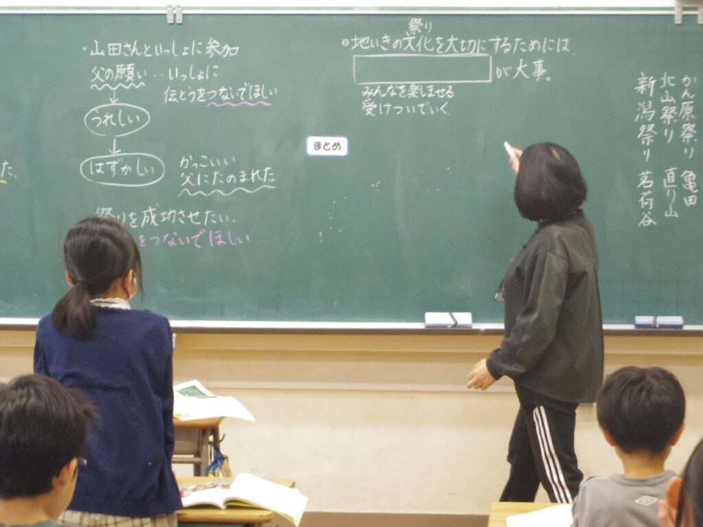 一方、4年2組教室は道徳の時間です。地域の文化を守るためには何が大切かを考えています。「受け継ぐこと」「進んで参加すること」という意見以外にも、「自分自身が楽しむ」といった目からウロコな意見も出ていました。先生はそれをちゃんと受け止めてつないでくれるので子どもたちは安心して発言できます。