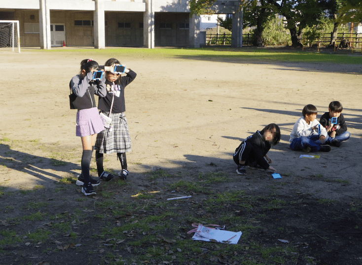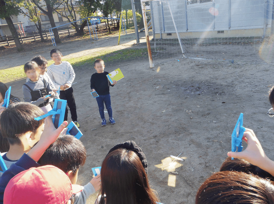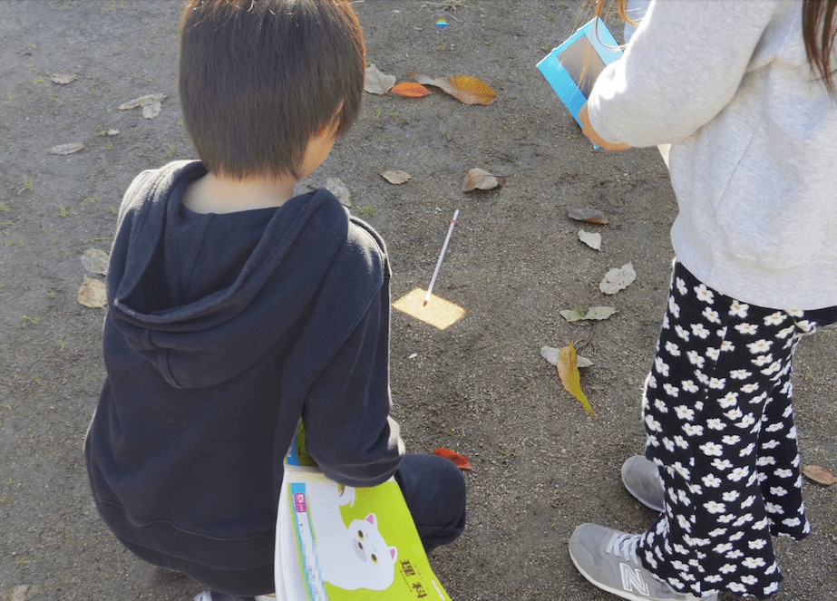 3年生は理科の光の実験です。「鏡で日光を反射させて温度計に当てたら、温度は変わるのか?」という課題です。5時間目、早くも西に傾き始めたお日様の光を、目を細めながら一生懸命集めます。