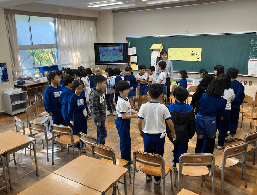 今日から新しい仲間が丸山小に加わりました。そのクラスでは、さっそく歓迎のセレモニー&ゲームをしていました。