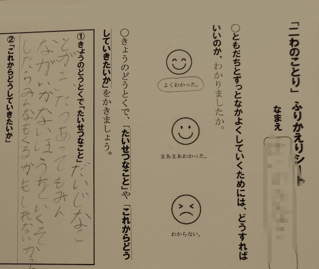 子どもたちは互いの考えを活発に交流させながら、教師の気付かせたかった「自分も相手も大切にする」という道徳的価値への理解を深めていきました。さらには、振り返りの場面では、教師の予想を超えるような「大人顔負け」の抽象的な考えや、学んだことを日常生活に活かそうとする態度が多く見られ、日々、子どもたちは先生や友だちと学び合いながらどんどん力を高めていることを目の当たりしました。「だいじなことが2つあっても、みんなが行かない方を行