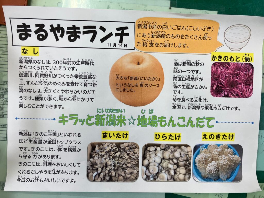 ということで、今週も最後の日まで子どもたちはよくがんばりました。がんばったらお腹が空くね。今日の給食は「地場もん」献立です。ぜいたくな「新高ソース」のかかった白身フライ、かきのもとの和え物、そしてきのこがたーくさん入ったお汁などなど、どれもとっても美味しかったです。