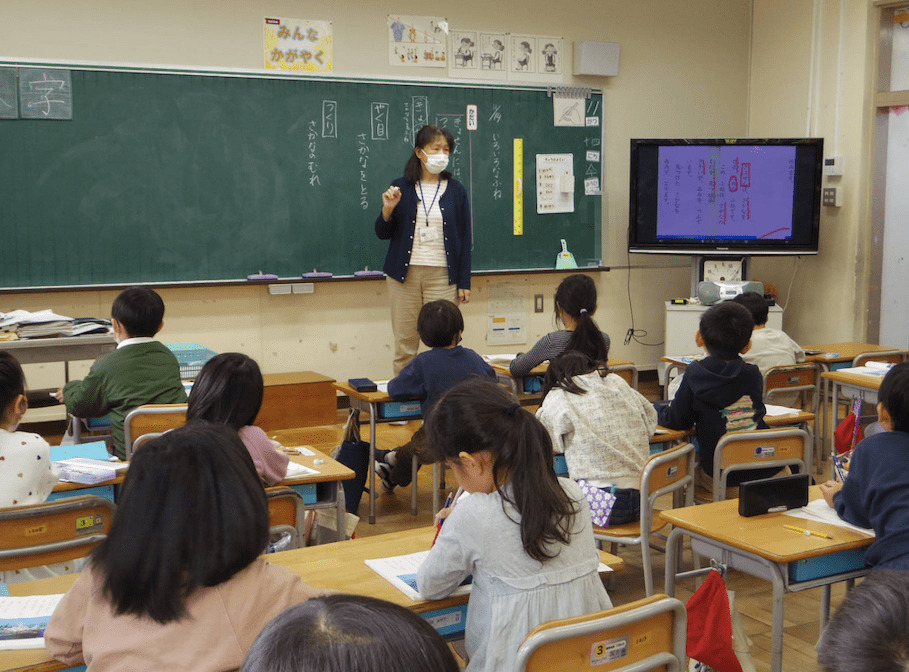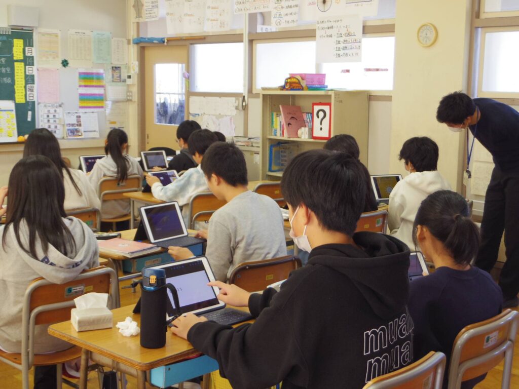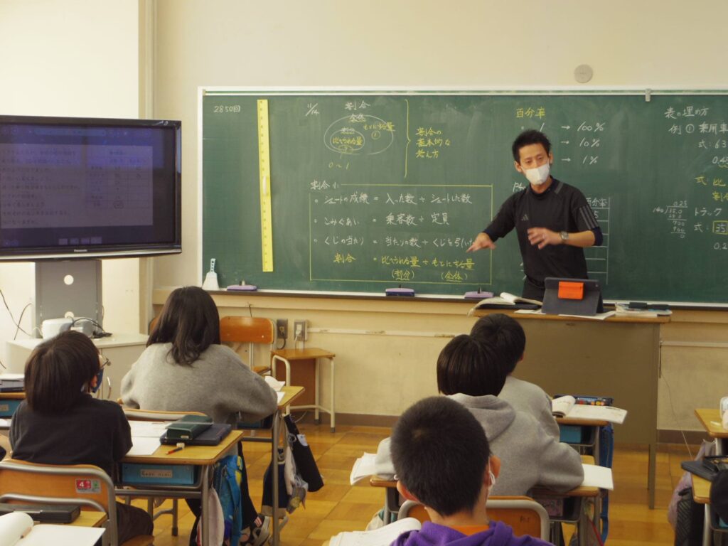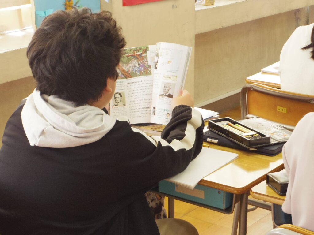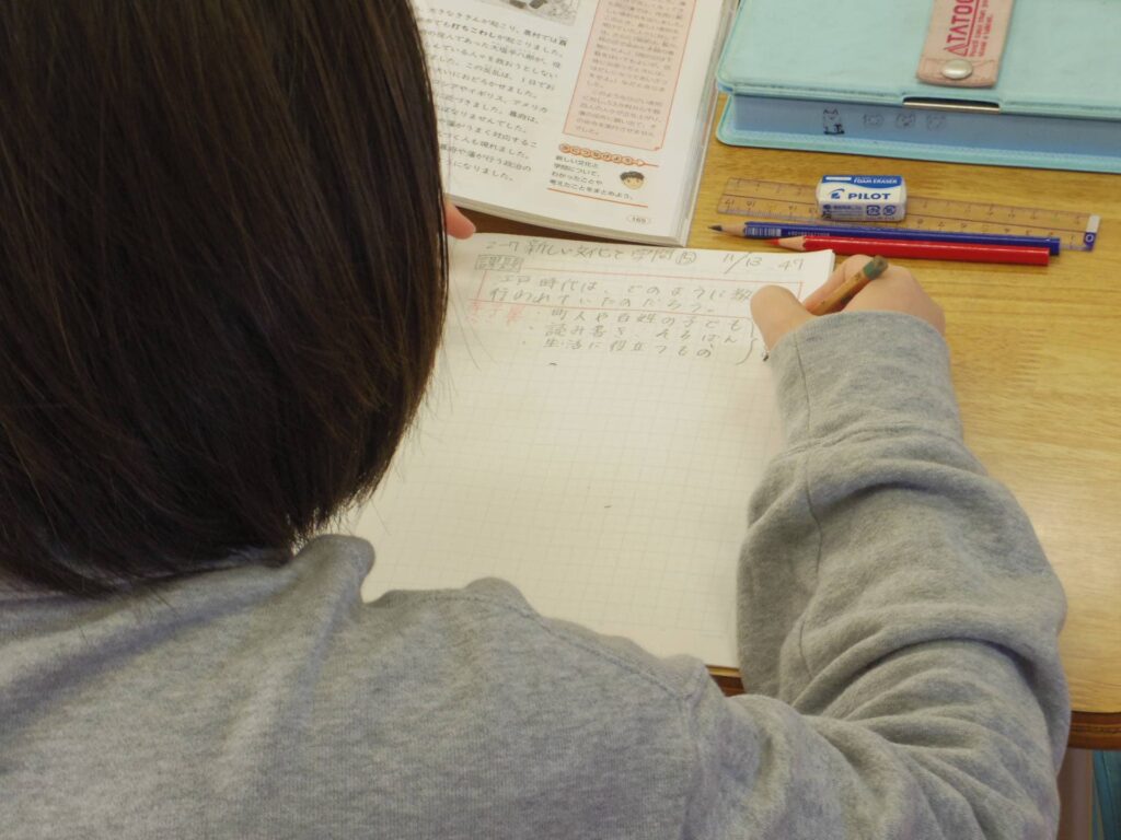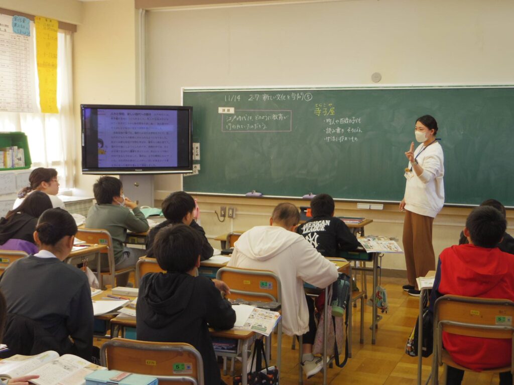 隣のクラスでは社会科の学習です。江戸時代の「寺子屋」の様子について、教科書や先生の話から理解を深めていました。