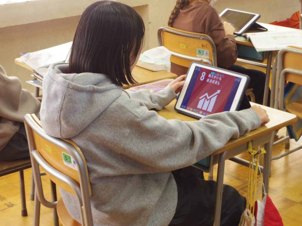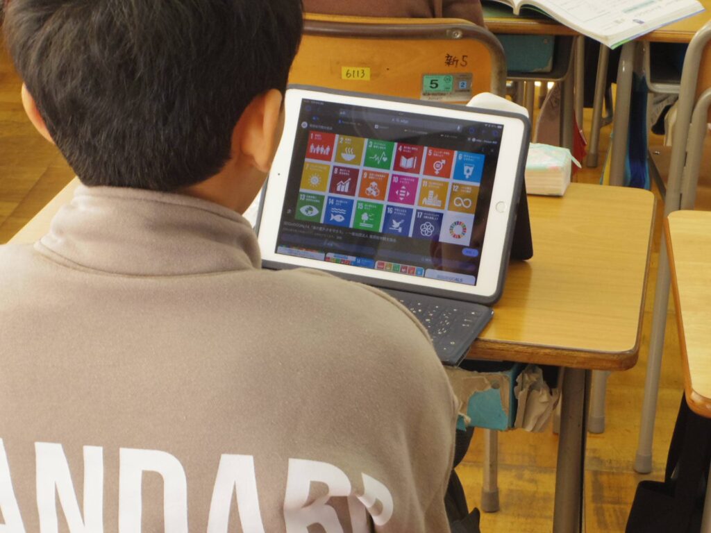 6年生では、SDG’Sの17の目標の中から自分の興味・関心のある項目について詳しく調べ、タブレットにまとめる活動をしていました。黒板の学習課題には「問題や事実を明確にする」と書かれています。6年生ともなるとレベルの高いことにチャレンジするんですね。