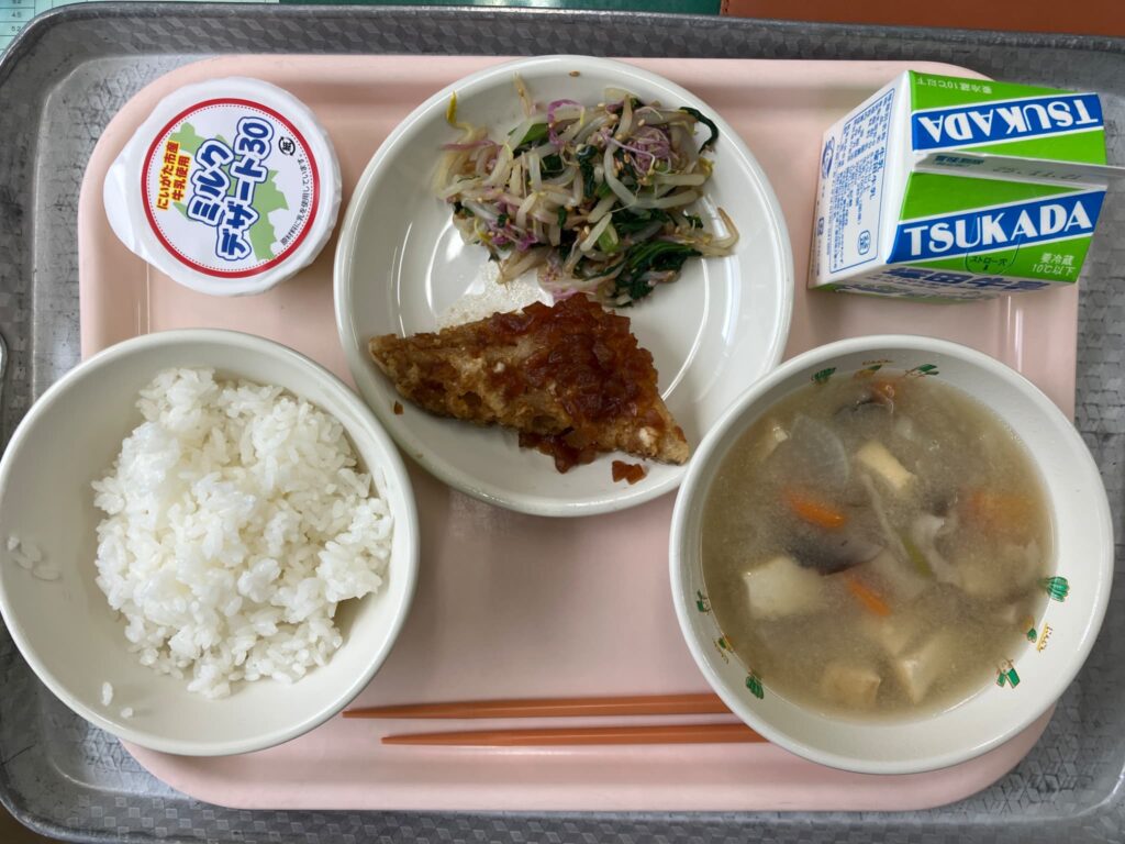 ということで、今週も最後の日まで子どもたちはよくがんばりました。がんばったらお腹が空くね。今日の給食は「地場もん」献立です。ぜいたくな「新高ソース」のかかった白身フライ、かきのもとの和え物、そしてきのこがたーくさん入ったお汁などなど、どれもとっても美味しかったです。