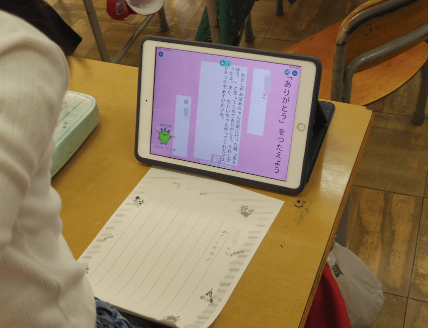 タブレットに下書きを書いて、先生にアドバイスをもらいに行きます。デジタルだからすぐに修正できるし、前に書いたものもコピーして残しておくことができますね。